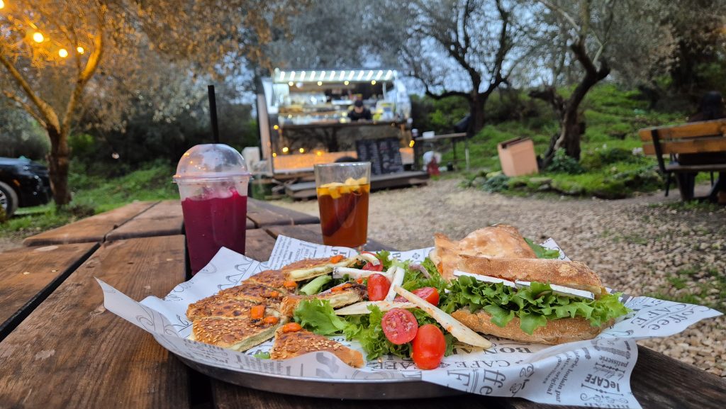 📍עצירה 2: רבע שעה ממנחת מגידו, מול נחל שקט וירוק, מסתתרת עגלת קפה כשרה שמגישה סנדוויצ’ים טריים שמוכנים במקום, חסה שנקטפת כל בוקר מהחממה וגבינות מיוחדות שאין בבית.